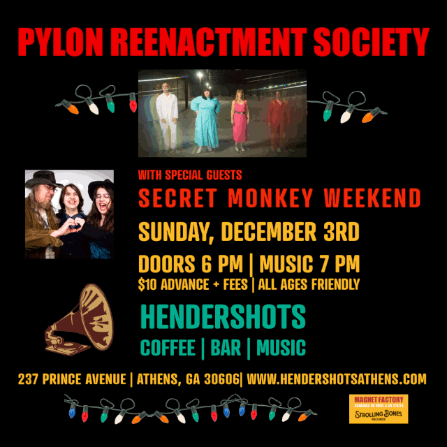 Pylon Reenactment Society will be performing a show at Hendershot's, 237 Prince Ave., Athens, GA, on Sunday, December 3, 2023.